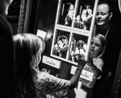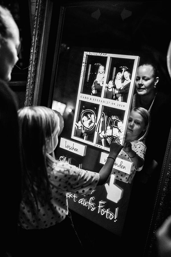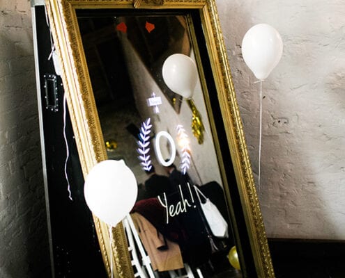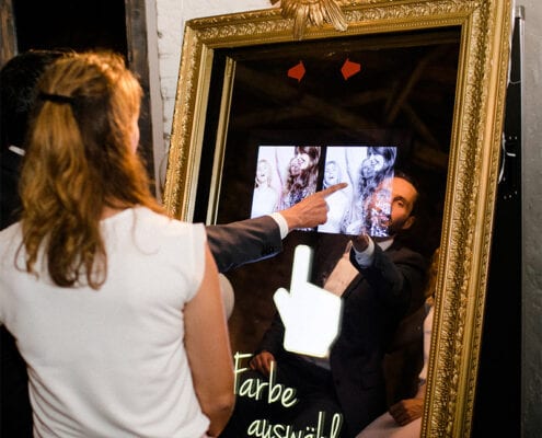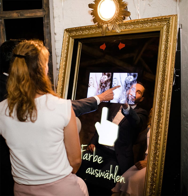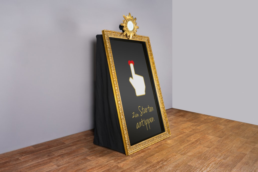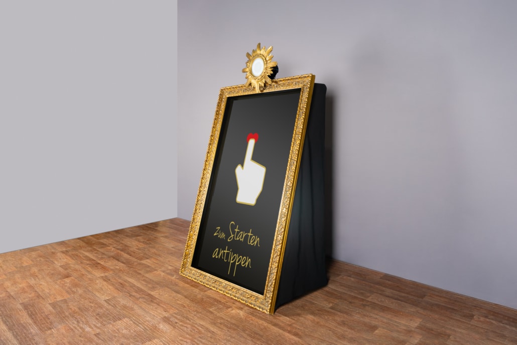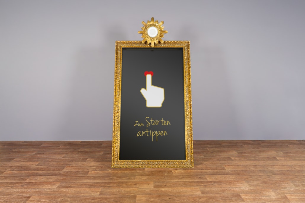 Der Spiegel ist ein vollautomatischer Fotospiegel mit Touchscreen für eine gute Bedienbarkeit. Der goldene Rahmen lässt den Automaten schick und modern wirken. Durch den Touchscreen kann man die Bilder später noch personalisieren und bemalen. Bei dem Spiegel werden die Bilder ausschließlich im Hochformat gemacht, dadurch ist nur ein Ausdruck im Postkartenformat (10x15cm) möglich. Dieser Fotospiegel ist perfekt für private & kleinere Events & enge Räumlichkeiten im Innenbereich.