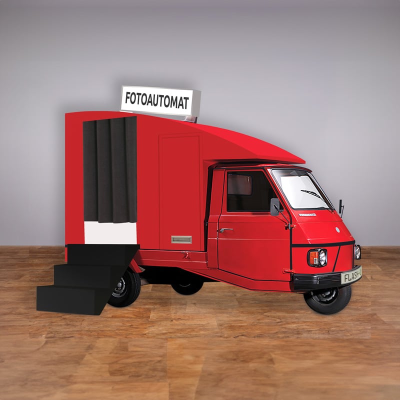 Unsere Ape rollt auch auf Deine Veranstaltung. Versehen mit einem Branding erstrahlt die Ape immer wieder in neuem Glanz. Dieser Automat bietet Platz für bis zu 8 Personen die über die Treppe leicht einsteigen können. Unser Fotomobil ist mit einem Touchscreen im inneren ausgestattet, was die Bedienung einfach macht. Für alle die es etwas privater mögen, kann man die Kabine auch mit einem kurzen oder langem Vorhang ausstatten.